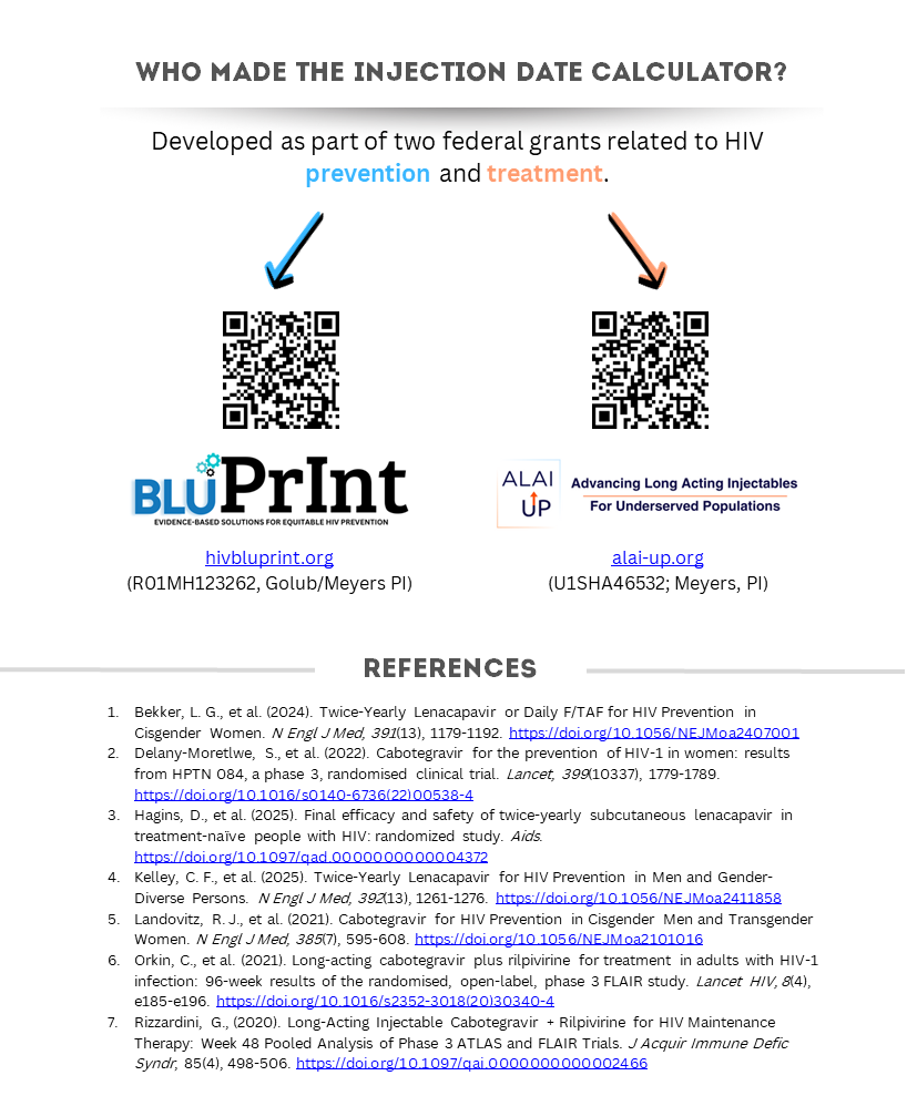 This calculator was developed as part of ALAI UP (U1SHA46532; Meyers, PI) and BLUPrInt (R01MH123262, Golub/Meyers PI). You can learn more about resources for HIV prevention on the BLUPrint Website and more about HIV treatment on the ALAI UP TargetHIV page. Technical assistance provided by Beller Tech, LLC.