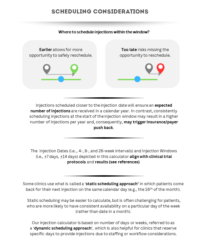 ℹ️ This calculator provides an estimated safe window for scheduling. Always consult with a healthcare provider before scheduling injections.