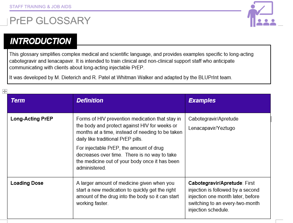 This glossary simplifies complex medical and scientific language, and provides examples specific to long-acting cabotegravir and lenacapavir. It is intended to train clinical and non-clinical support staff who anticipate communicating with clients about long-acting injectable PrEP.